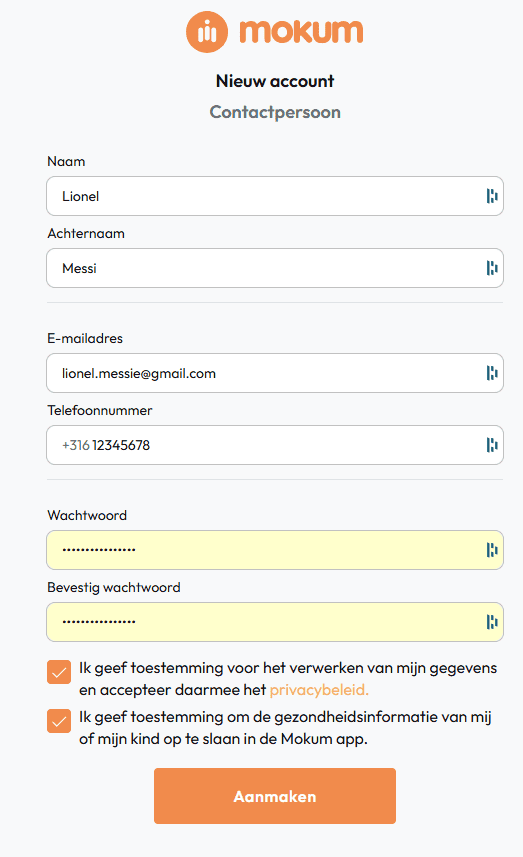 Bewaar de inloggegevens goed, je hebt ze de volgende keer dat je je kind wil aanmelden weer nodig. Je kunt ook de aanmeldingen wijzigen of de status bekijken binnen de Mokum app.