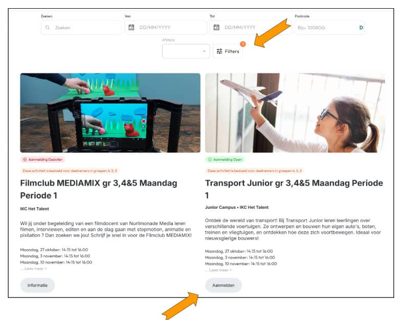 Je vindt hier activiteiten voor verschillende groepen. Per dag in de week zijn er verschillende activiteiten. De beste manier om de activiteiten te vinden die bij jouw kind passen is om de Filters te gebruiken – hier kan je bijvoorbeeld zoeken naar alle activiteiten die bij groep 3 horen, of zoeken naar alle activiteiten die op maandag gehouden worden.